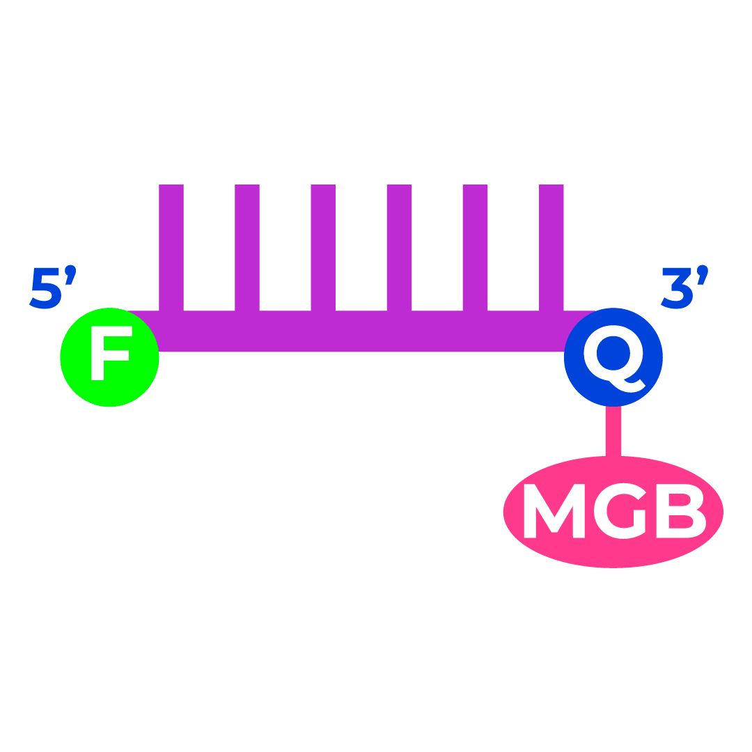 Nas sondas de hidrólise, o MGB é acoplado à extremidade 3' da sonda, junto com o quencher (supressor de fluorescência). É importante entender que o MGB, por si só, não tem a função de suprimir o sinal fluorescente, esse papel pertence ao quencher. O que o MGB faz é modificar as propriedades físicas da sonda, tornando-a mais estável e eficiente na ligação ao DNA-alvo.